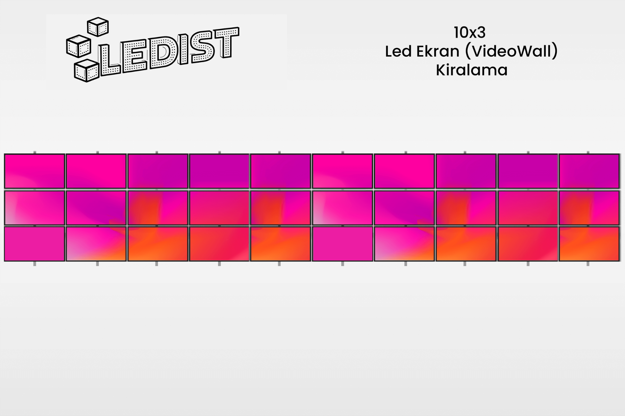 Ledist firması olarak, 10x3 LED Ekran hizmeti sunmaktayız. Bu hizmetimiz, müşterilerimizin organizasyonlarında canlı ve dikkat çekici bir görsel deneyim sunmalarına olanak tanımaktadır. 10x3 videowall ekranlarımız, etkinliklerinizi etkileyici hale getirecek, katılımcıların ilgisini çekecek ve görsel açıdan güçlü bir etki bırakacaktır.